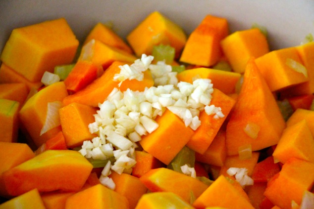 Now it is very easy to cut into equal cubes. Equal pieces cook evenly, so stick with a little less than an inch sized cubes, but do not worry too much since this soup is going to be puréed.