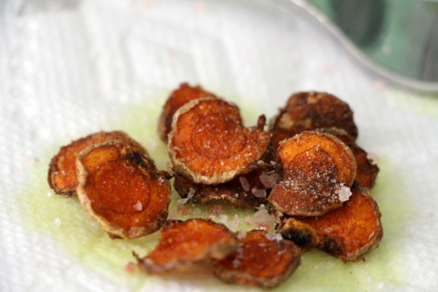 For some optional Toppings: You may cut turmeric root into thin circles and fry them until they lightly crisp up, add a little coarse salt on them; they still keep their distinctive turmeric taste, so one or two on each servings is enough. Classic homemade croutons are great in this soup! Another fun topping is coconut chips, I also use one or two chips just to fancy things up. To give this velvety soup a little “kick”, I like to loosen up Harissa paste with some oil and use a little bit to top each serving. This combo of flavors will make the leaves blow off the trees… 🙂