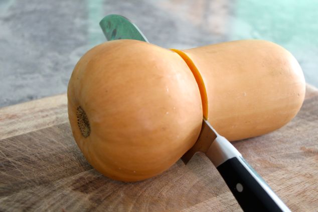 Use a big wide knife and first cut right where “the neck” meets the curvy/bottom part of the butternut squash. A little Tip: If you don’t use the whole butternut squash, choose to use the bottom part (the part with the seeds) first. The other part (without the seeds) stores better and longer in the refrigerator. This time we use the whole butternut squash, so after cutting at “the neck”, cut each part in half.