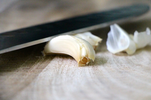 Give each garlic clove a little smash for easy peel, chop it and add to the pot.