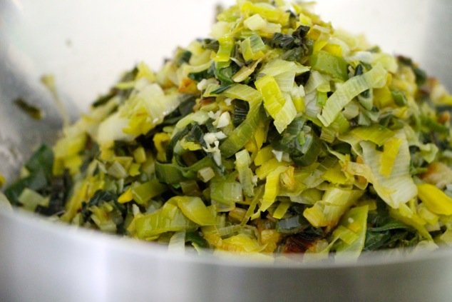 Time to add the eggs. I ended up using 5 eggs for this mixture…another time I used 6 eggs…maybe the leeks were a little bigger…but take a look at the texture of the mixture it looks loose but not too liquidy. Mix well as always 🙂