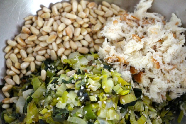 Transfer the leek and garlic mixture into a big bowl. Add toasted pine nuts and 1 cup of lightly wet bread shreds.